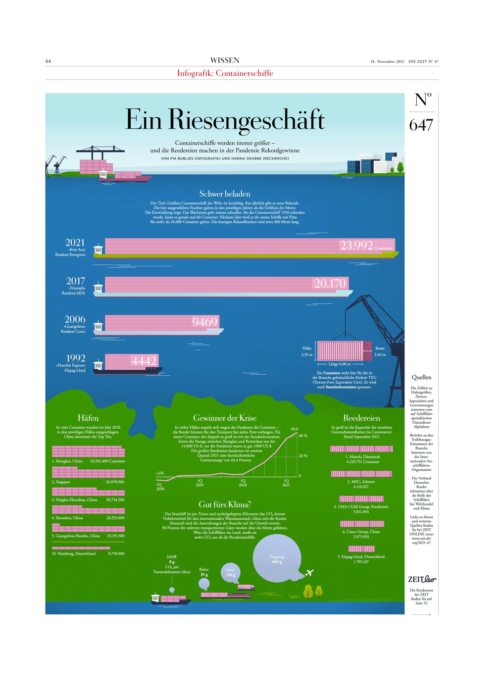 Infografikseite für DIE ZEIT zum Thema Containerschiffe